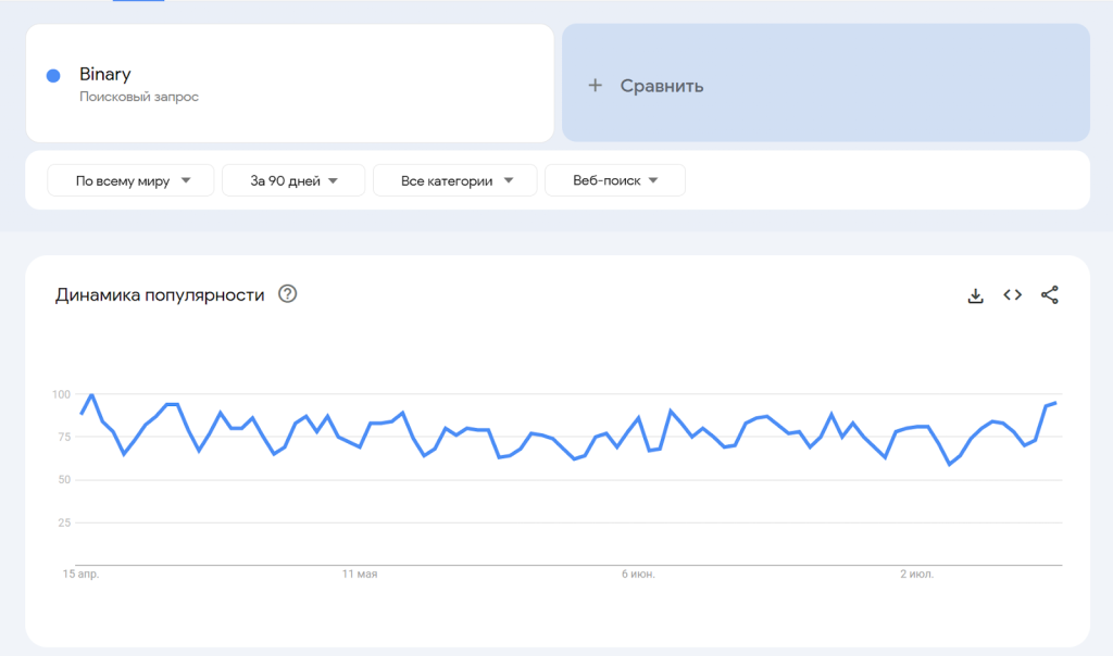 Мы проверили растущий спрос на проект в Google Trends и Wordstat: интерес к запросу «Бинари сайт» и «Бинари отзывы» заметно увеличился с начала года. Платформа становится всё популярнее в странах СНГ и за рубежом.