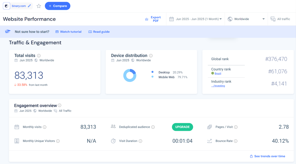Отчёт Similarweb за июнь 2025 по компании фиксирует 83 313 визитов, что на 33,58 % меньше, чем в мае. Глобальный ранг ресурса опустился до #376 470, а в Бразилии площадка держится на позиции #61 076, оставаясь в топ‑5 000 индустрии Investing. Мобильная аудитория доминирует: 79,71 % заходят через браузер смартфона, десктоп составляет лишь 20,29 %. Пользователь проводит на сайте в среднем 1 минуту 4 секунды, просматривая 2,78 страницы; показатель отказов — 40,12 %. Всего ежемесячных уникальных гостей пока не раскрыто, но динамика посещений подчёркивает необходимость доработок UX и продвижения.
