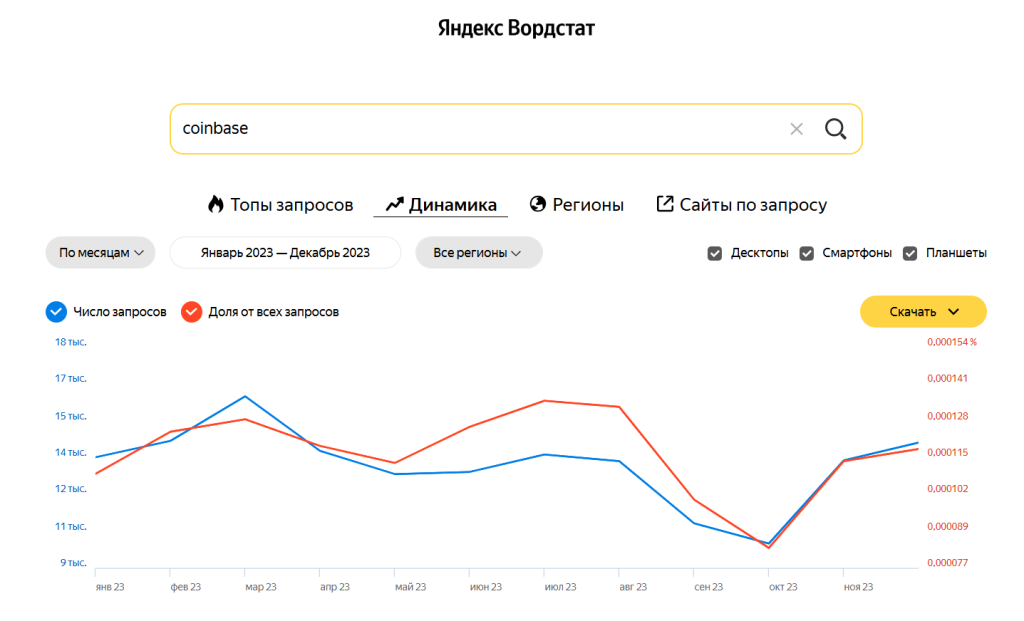 Интерес к запросу «Coinbase криптовалюта» за последние 12 месяцев упал на 20 % — это значит одно: аудитория падает.