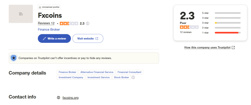 Скриншот с Trustpilot: рейтинг FXCoins — 2.3 из 5 на основе 12 отзывов. Большинство оценок — 1 звезда, что подтверждает репутацию ненадёжного и потенциально мошеннического брокера.